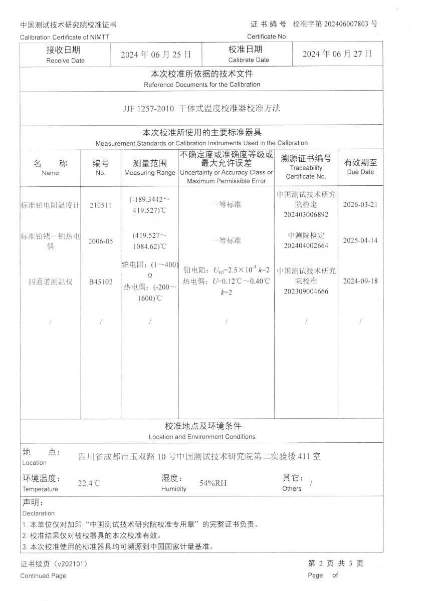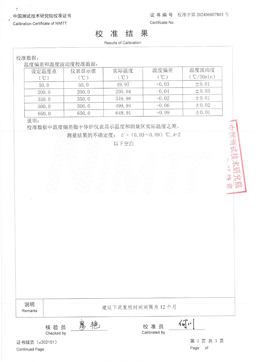 中溫干體爐(50~650℃)校準(zhǔn)證書 2024-7-1 本文被閱讀 6768 次