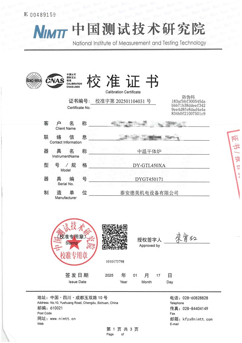 中溫干體爐(室溫+5~400℃)校準(zhǔn)證書 2025-1-20 本文被閱讀 5697 次