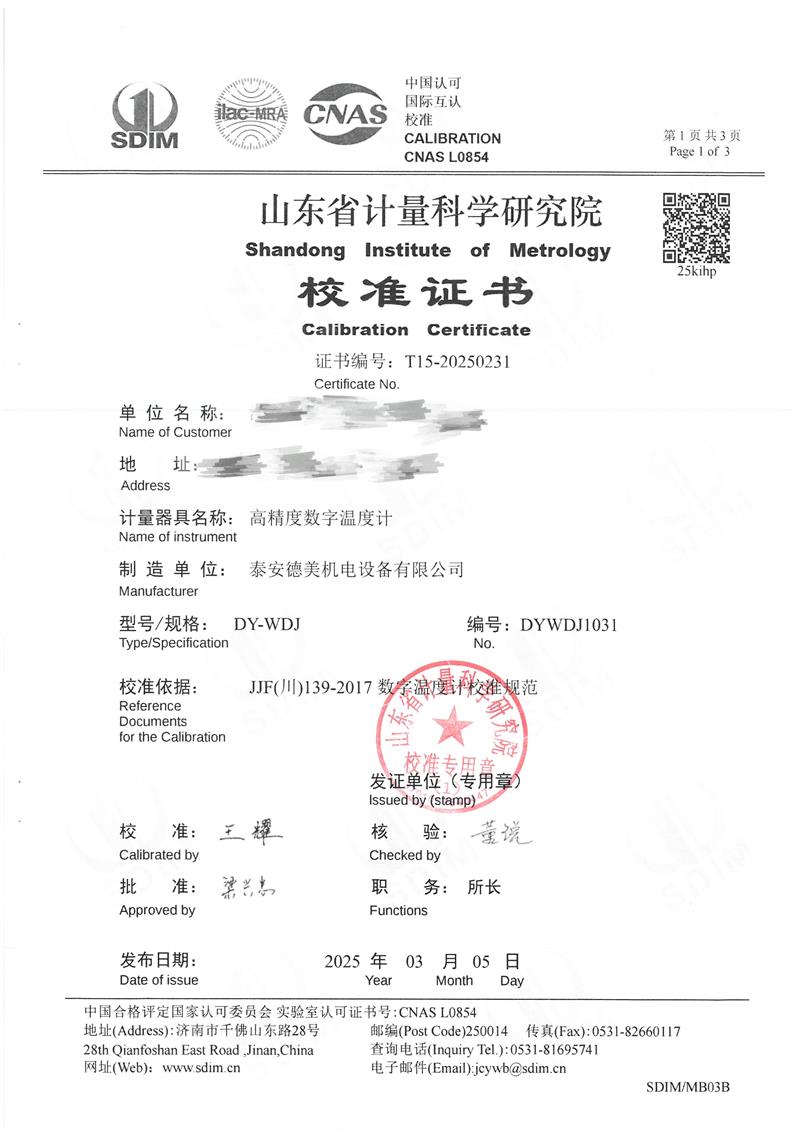 高精度數(shù)字溫度計校準證書 2025-3-8 本文被閱讀 3890 次