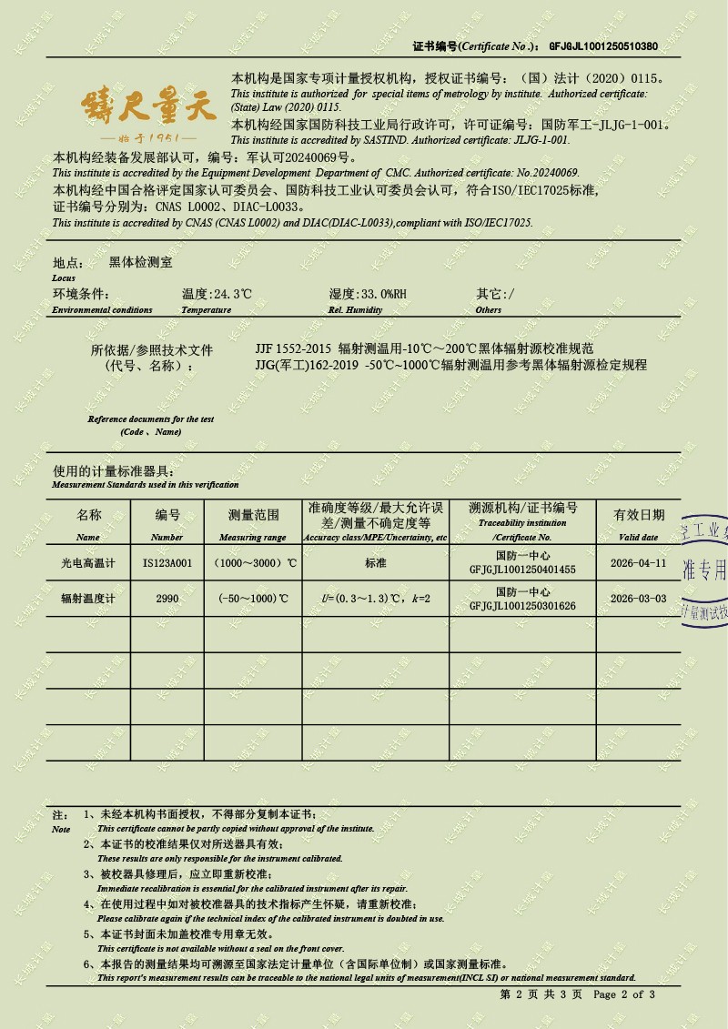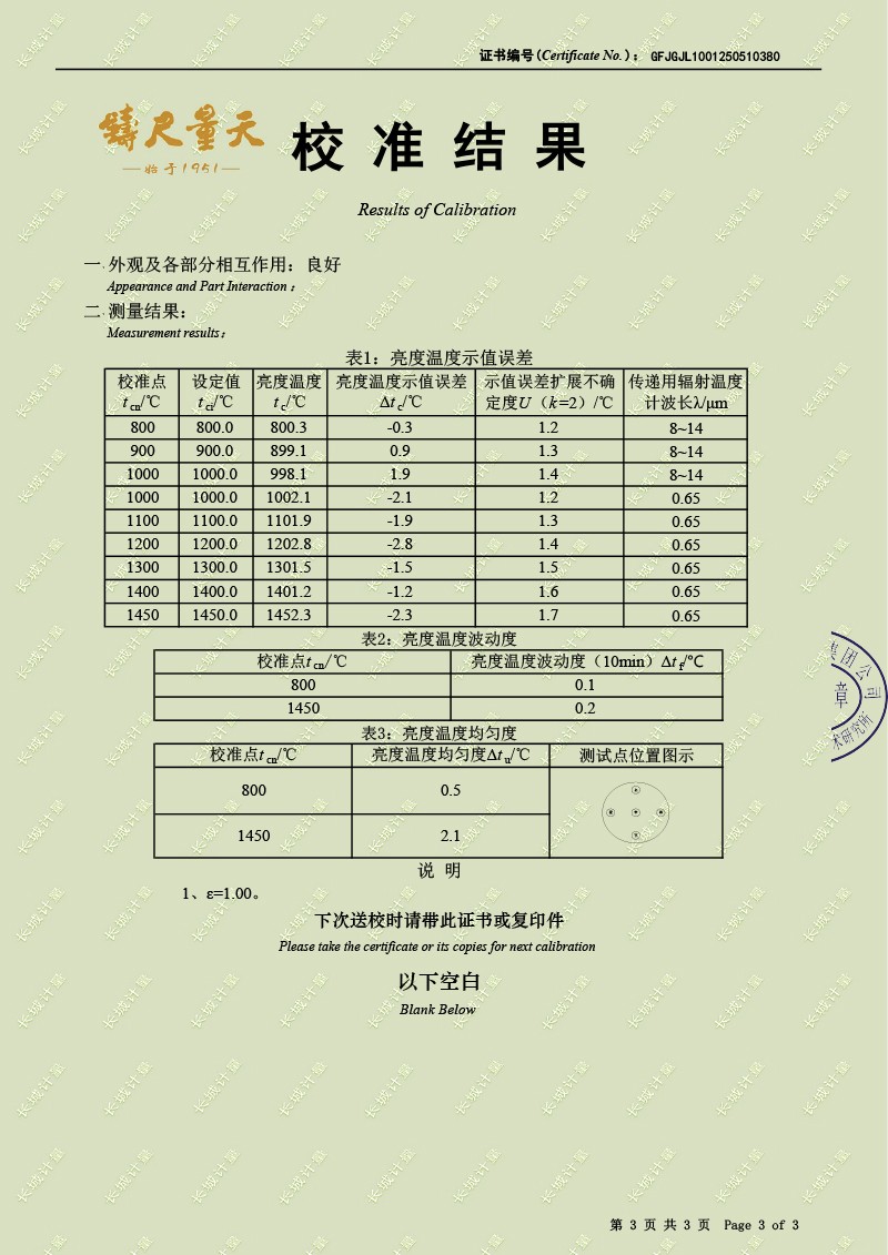 腔式黑體輻射源(800-1450℃)校準證書 2025-5-28 本文被閱讀 4005 次