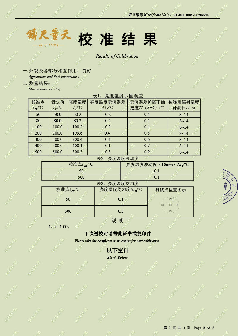 黑體輻射源(50-500℃)校準證書 2025-9-12 本文被閱讀 2331 次