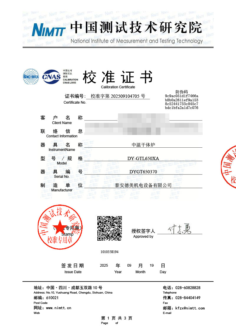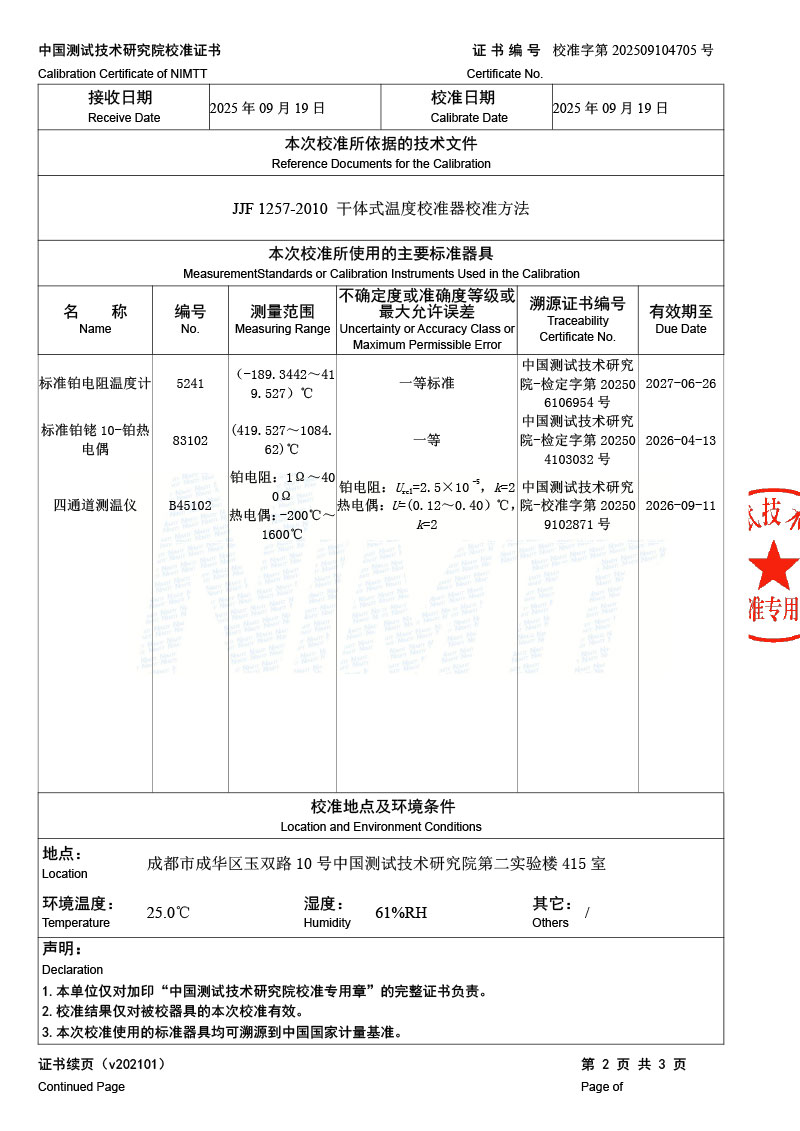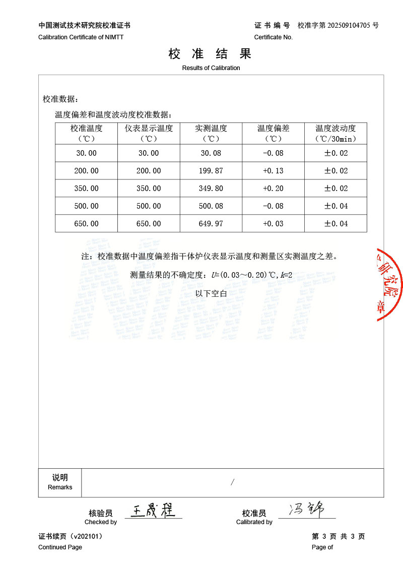 中溫干體爐(30-650℃)校準證書 2025-9-22 本文被閱讀 2192 次