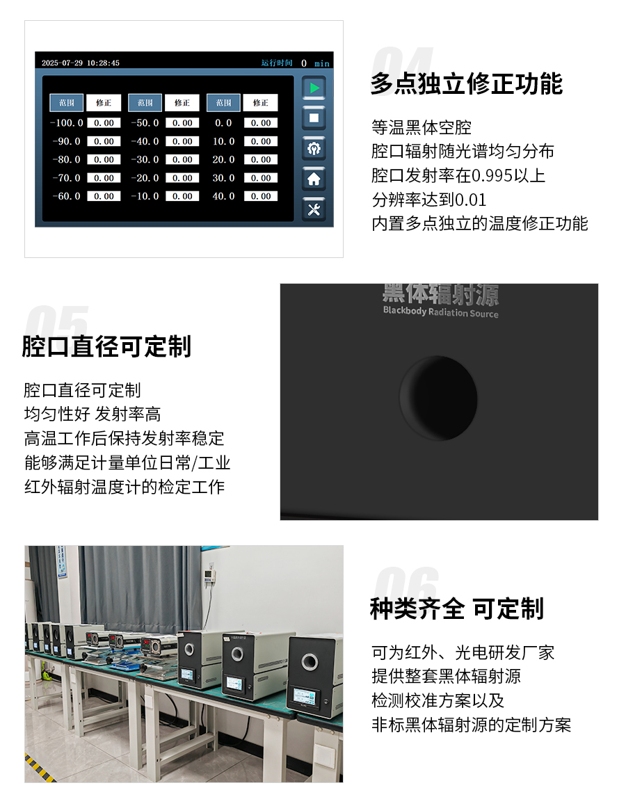 5)等溫黑體空腔,只一個腔口,腔口輻射隨光譜均勻分布,腔口發(fā)射率在0.995以上,分辨率達(dá)到0.01;