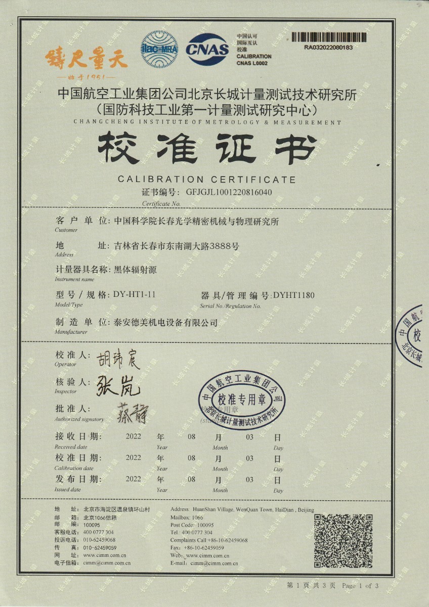 | 上一條:中國科學(xué)院長春光學(xué)精密機(jī)械與物理研究所-黑體爐DY-HT1-2 | 下一條:低溫干體爐-校準(zhǔn)證書 |