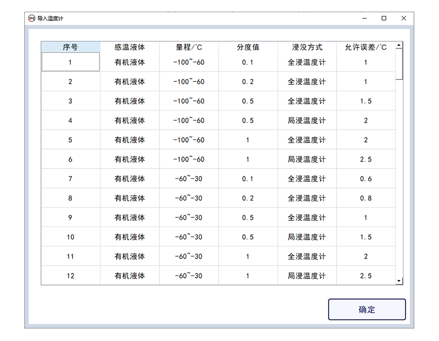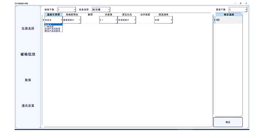 4.可進(jìn)行玻璃溫度計(jì)的類型選擇,選擇分度值、浸沒類型計(jì)允差,判斷溫度是否合格,