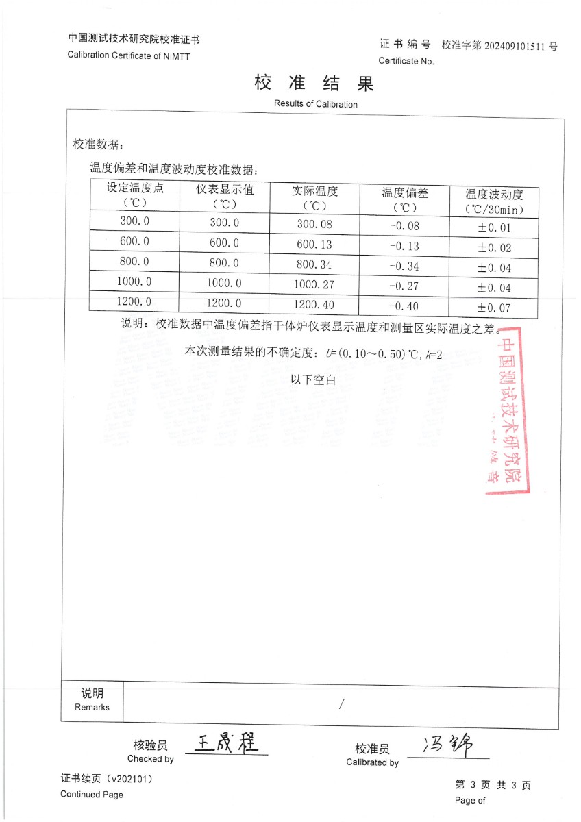 高溫干體爐(300~1200℃)校準(zhǔn)證書 2024-9-11 本文被閱讀 6974 次