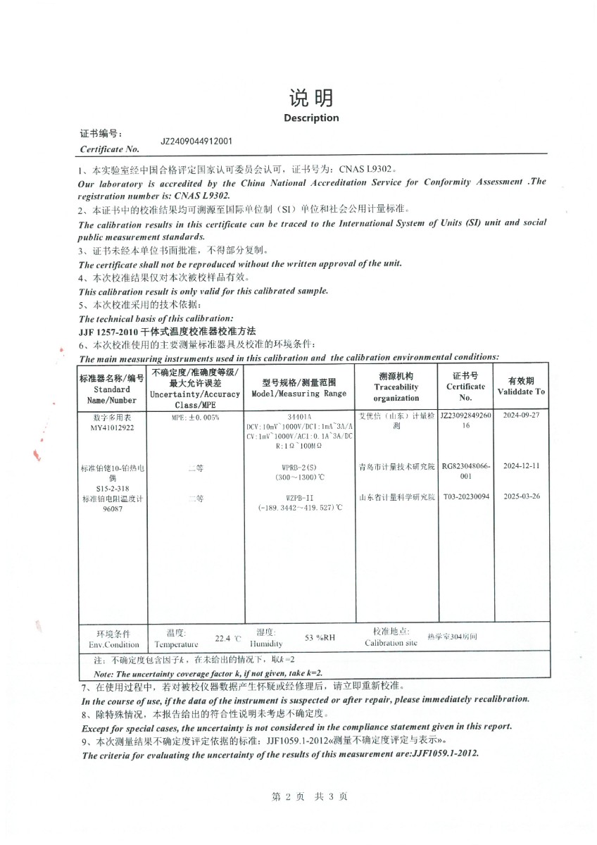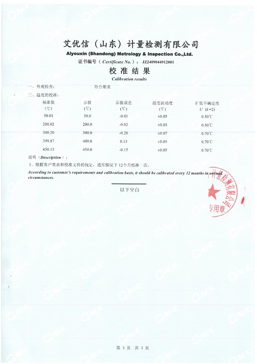 中溫干體(50~450℃)校準證書 2024-9-18 本文被閱讀 7027 次