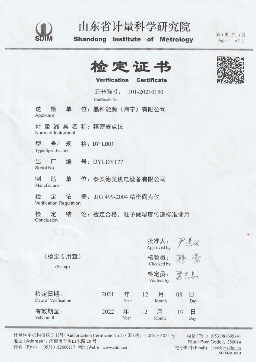 晶科能源(海寧)有限公司-精密露點儀(濕度) 2021-12-14 本文被閱讀 14718 次