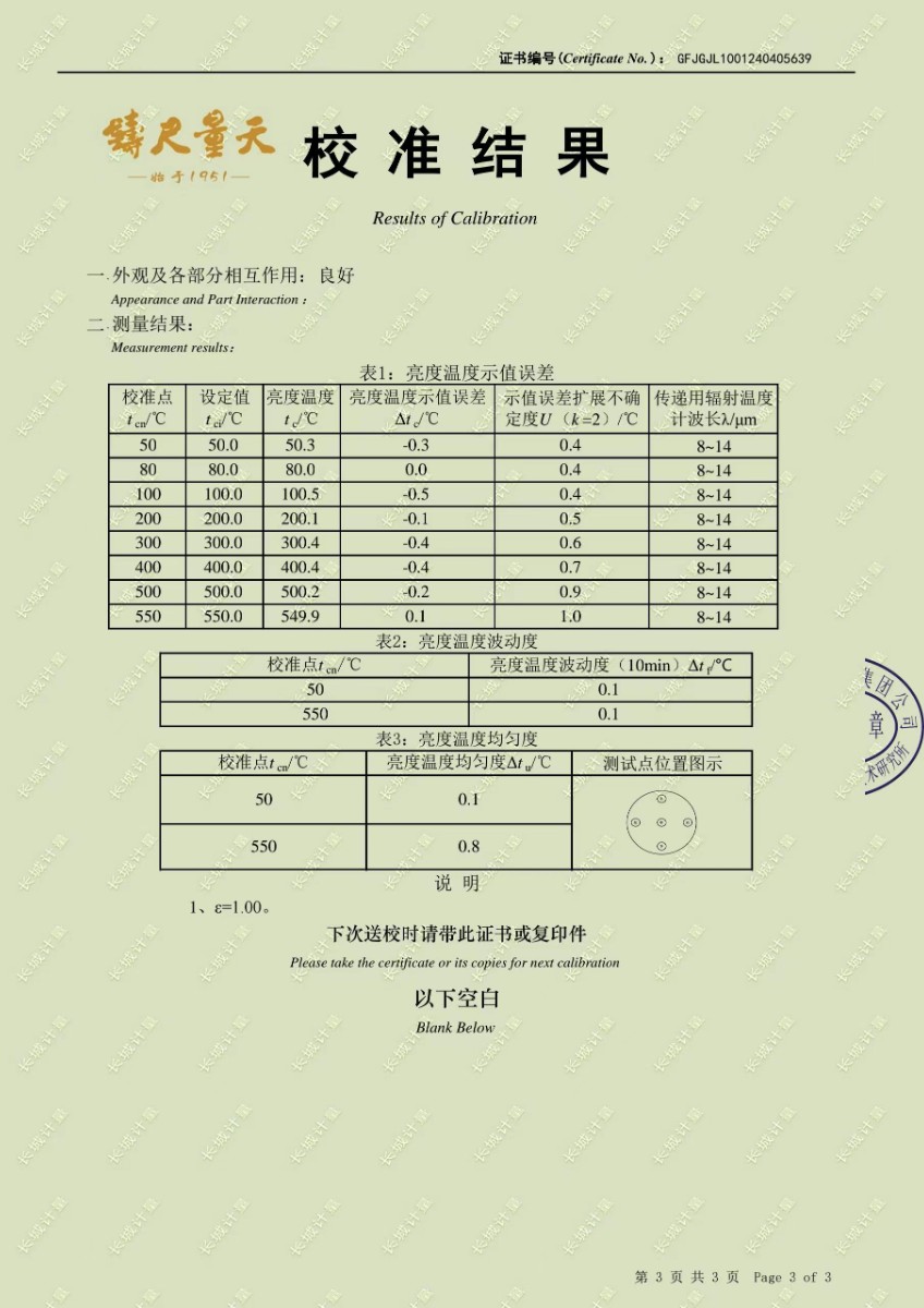 黑體爐校準(zhǔn)證書 2024-4-24 本文被閱讀 9772 次