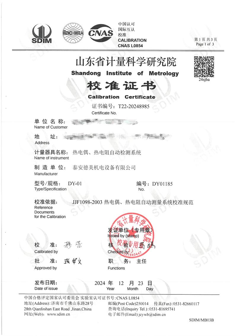 熱電偶、熱電阻自動檢測系統(tǒng)校準證書 2024-12-26 本文被閱讀 6321 次