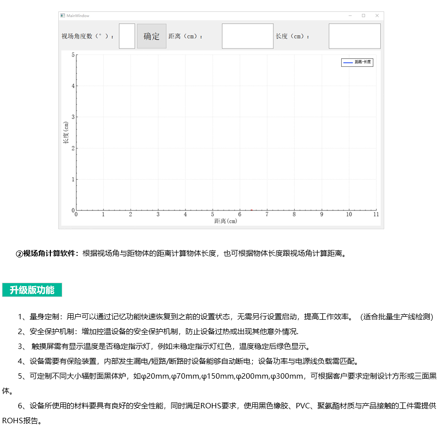 功能 | ① 支持 232 通訊或485通訊 ② 發(fā)射率可調(diào)功能(0.95-1之間可調(diào),出廠默認(rèn)發(fā)射率 0.95) ③提供視場角計(jì)算軟件 ④安全保護(hù)機(jī)制 ⑤可程式控制功能 | |