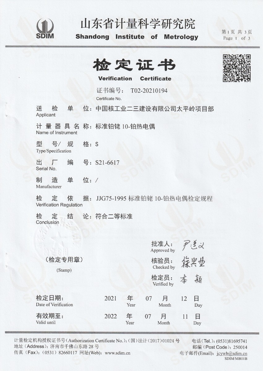中國(guó)核工業(yè)二三建設(shè)有限公司太平嶺項(xiàng)目部-標(biāo)準(zhǔn)鉑銠10-鉑熱電偶
