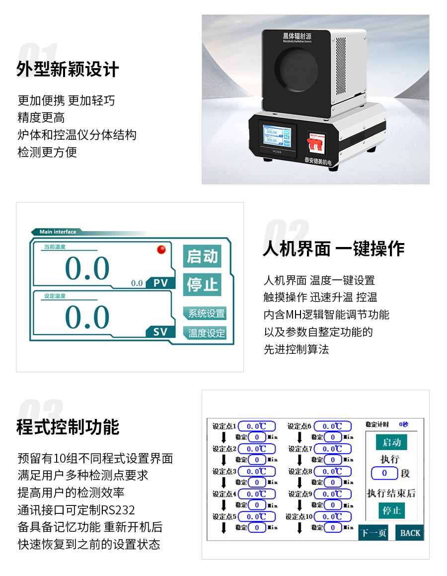 標(biāo)準(zhǔn)黑體作為標(biāo)準(zhǔn)輻射源,主要用于校準(zhǔn)輻射溫度計、紅外溫度計和輻射溫度傳感探測器。我公司目前具有先進(jìn)的黑體技術(shù),產(chǎn)品種類全、溫度范圍寬的黑體系列產(chǎn)品。產(chǎn)品體積小、重量輕、便于攜帶,不僅適合各級計量機(jī)構(gòu)實驗室校準(zhǔn)輻射溫度計使用,同時可以用于現(xiàn)場校準(zhǔn)。面源黑體輻射源是紅外輻射工作標(biāo)準(zhǔn),廣泛應(yīng)用在紅外探測器的研制過程中的工藝測試和鑒定試驗的技術(shù)指標(biāo)測試中。同時,面源黑體輻射源作為紅外成像棱準(zhǔn)裝置的核心設(shè)備,配合紅外準(zhǔn)直光學(xué)系統(tǒng)和紅外靶標(biāo),完成紅外成像系統(tǒng)等關(guān)鍵技術(shù)指標(biāo)測試和性能評估。可以滿足我國新研制的紅外成像制導(dǎo)武器中紅外成像器的測試需求,可以滿足廣泛應(yīng)用于醫(yī)療、建筑、安全監(jiān)控、環(huán)境檢測等行業(yè)紅外熱像儀的測試需求。