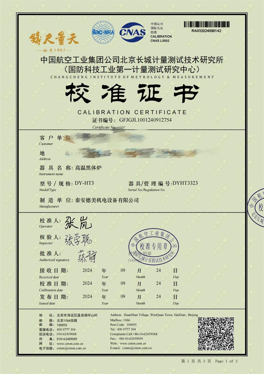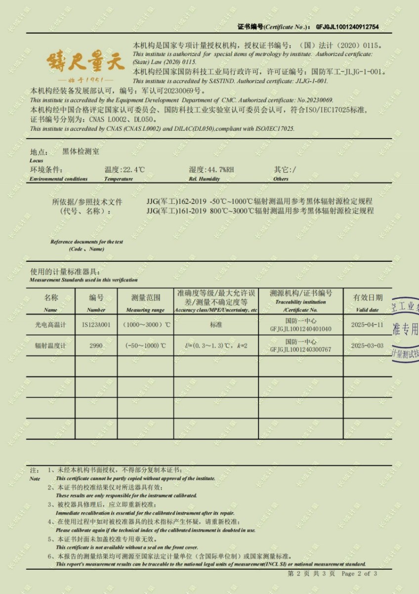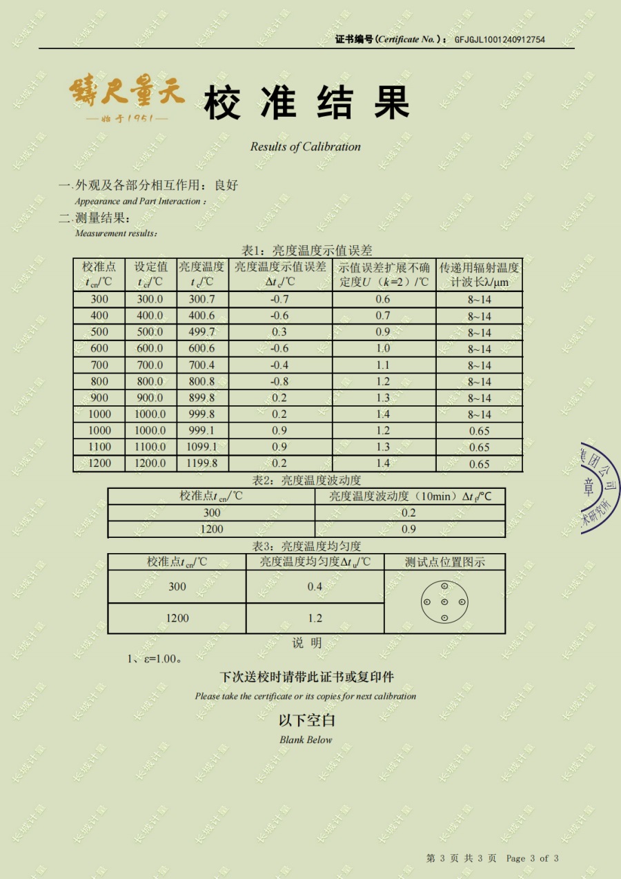 高溫黑體爐(300-1200℃)校準證書 2024-10-17 本文被閱讀 6107 次
