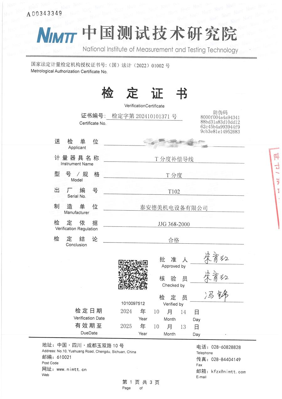 T分度補償導線檢定證書 2024-10-17 本文被閱讀 7036 次