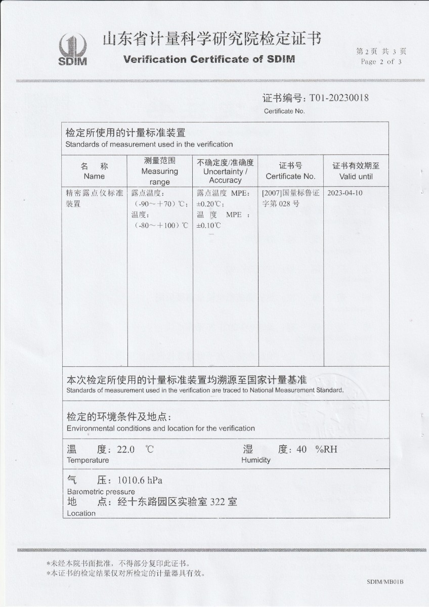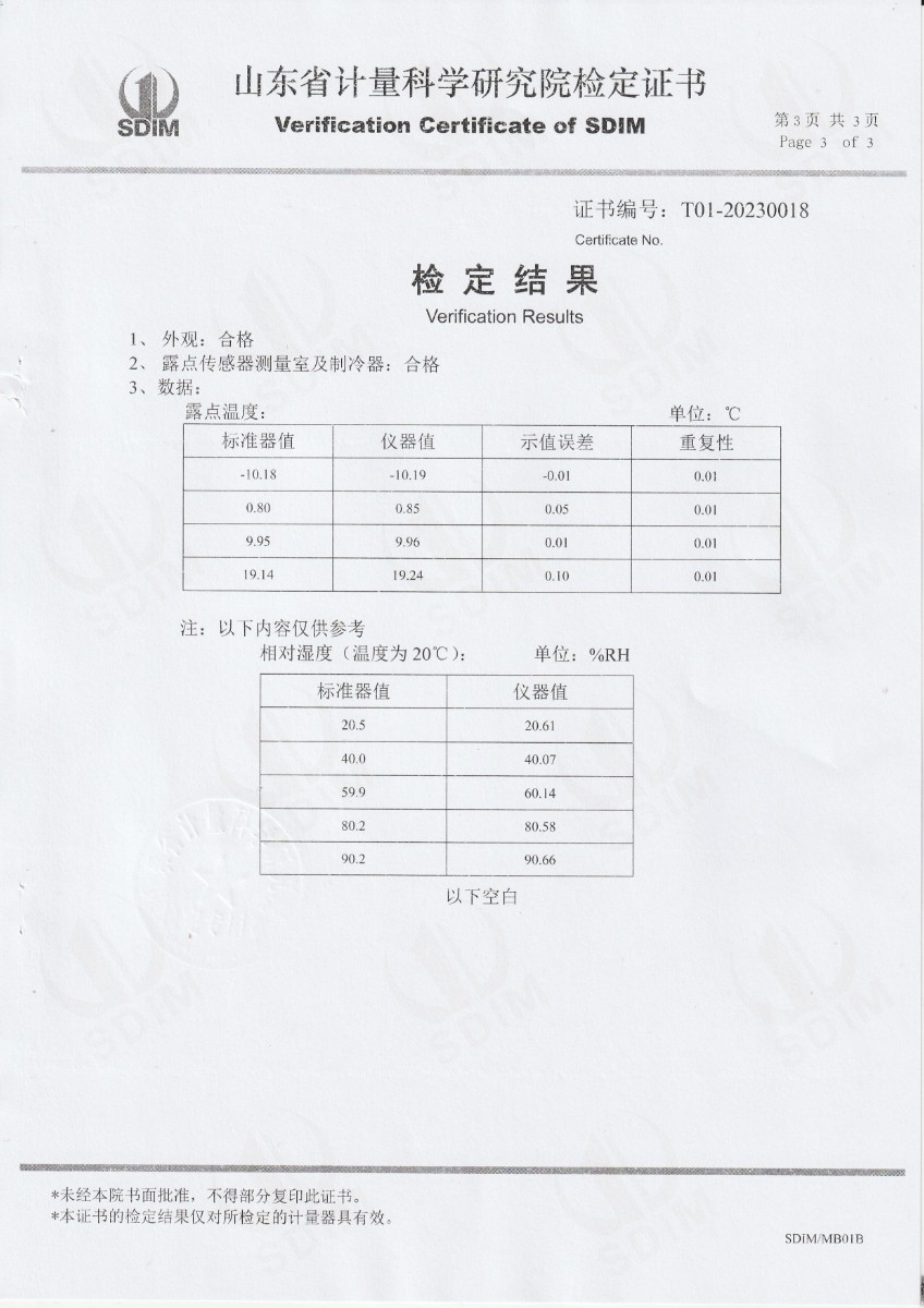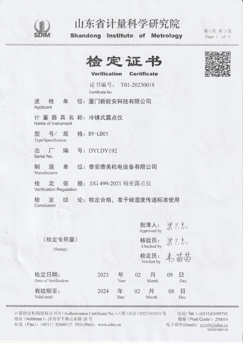 廈門新能安科技有限公司 冷鏡式露點儀 檢定證書 2023-2-25 本文被閱讀 10560 次