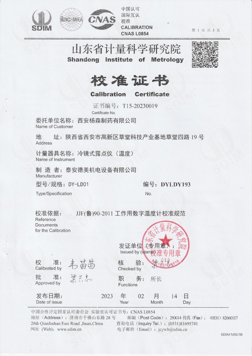 西安楊森制藥有限公司 冷鏡式露點儀(溫度) 校準證書 2023-2-25 本文被閱讀 13612 次