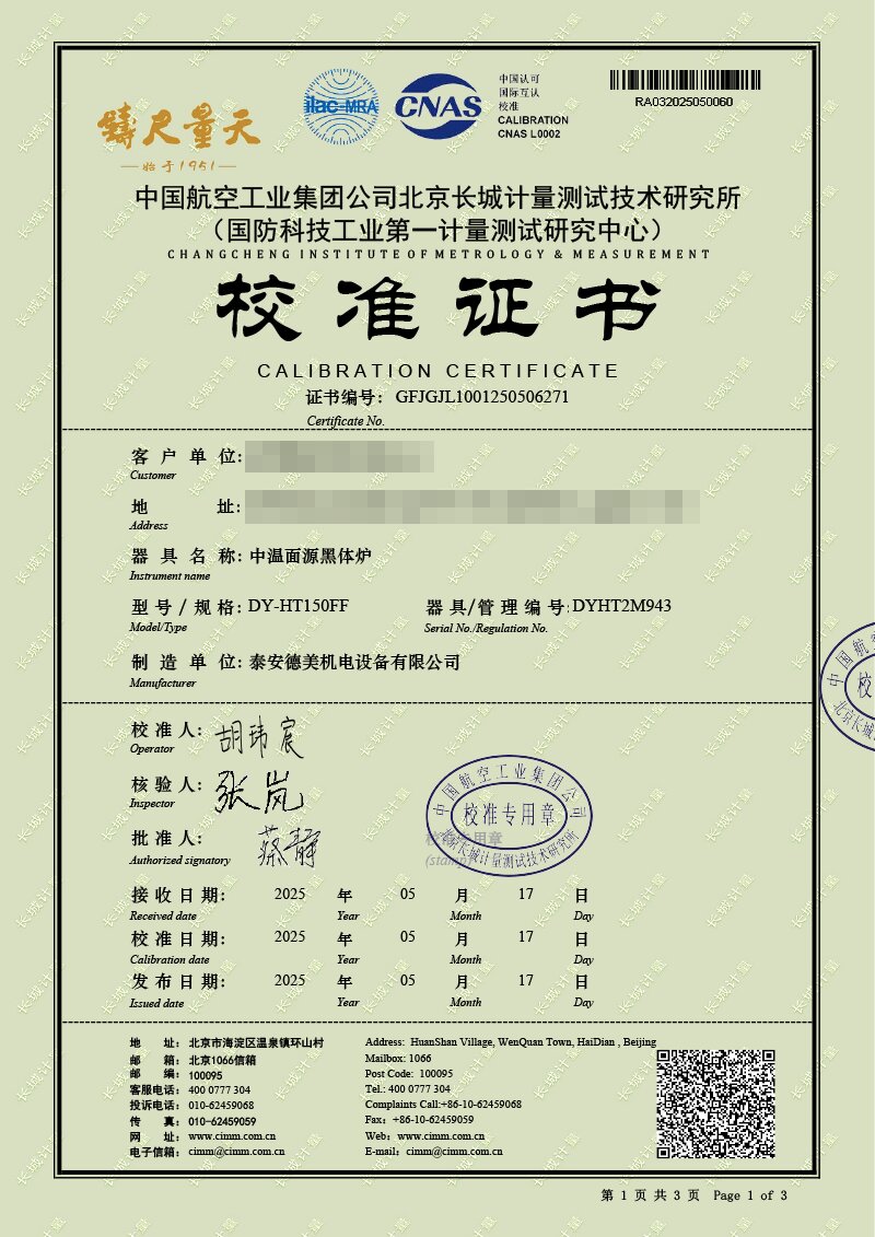 中溫面源黑體爐(室溫+5-500℃)校準證書 2025-5-21 本文被閱讀 4091 次
