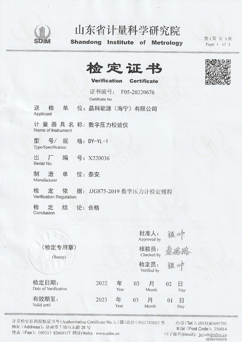 晶科能源(海寧)有限公司-數(shù)字壓力計校驗儀 2022-3-16 本文被閱讀 12652 次
