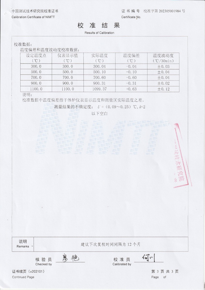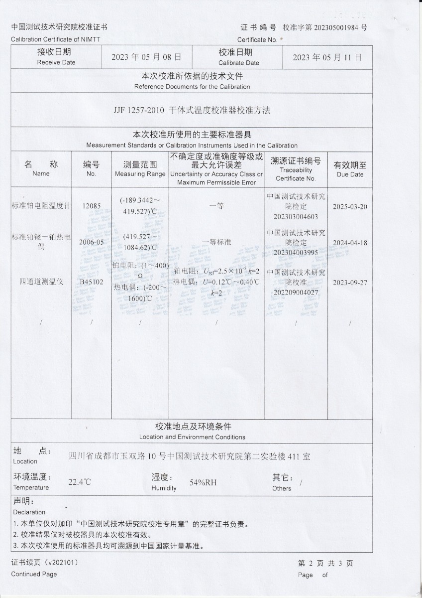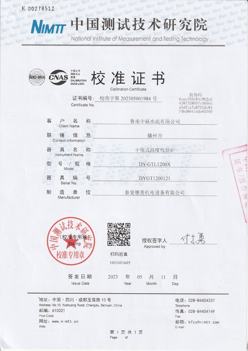 魯南中聯水泥有限公司 干體式溫度校準器 校準證書 2023-5-26 本文被閱讀 10633 次