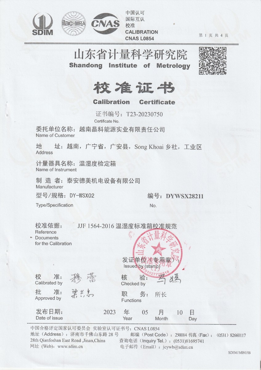 越南晶科能源實(shí)業(yè)有限責(zé)任公司 溫濕度標(biāo)準(zhǔn)箱 校準(zhǔn)證書(shū)