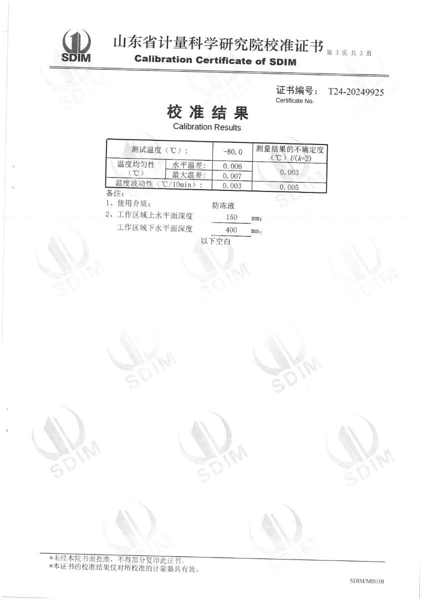 制冷恒溫槽(-80~95℃)校準(zhǔn)證書 2024-6-26 本文被閱讀 6615 次